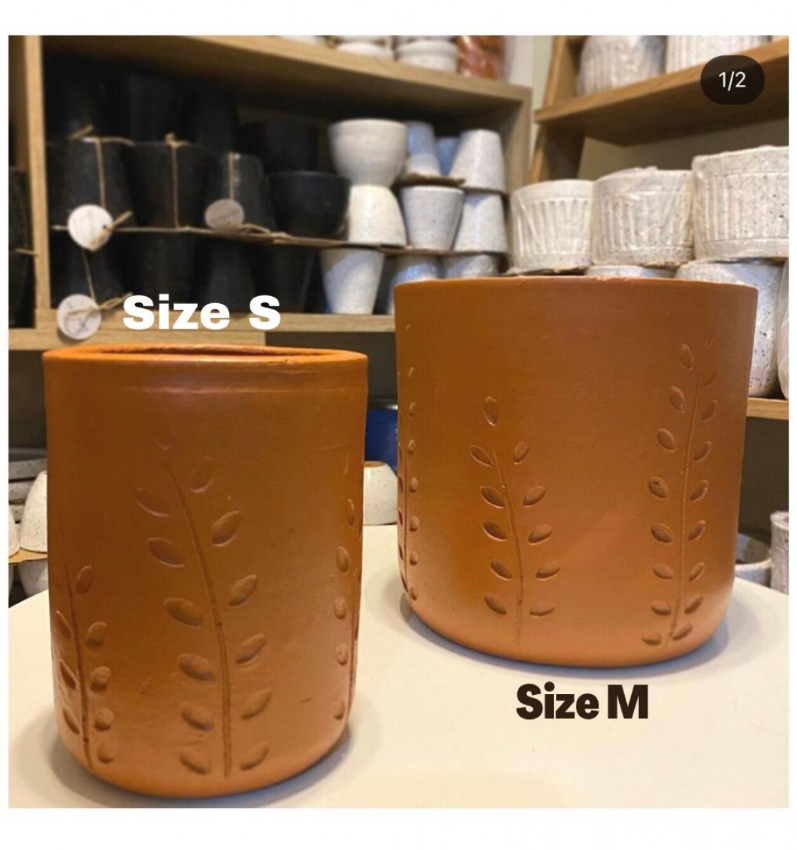 Pot handmade berbahan dasar tanah liat dengan motif daun.